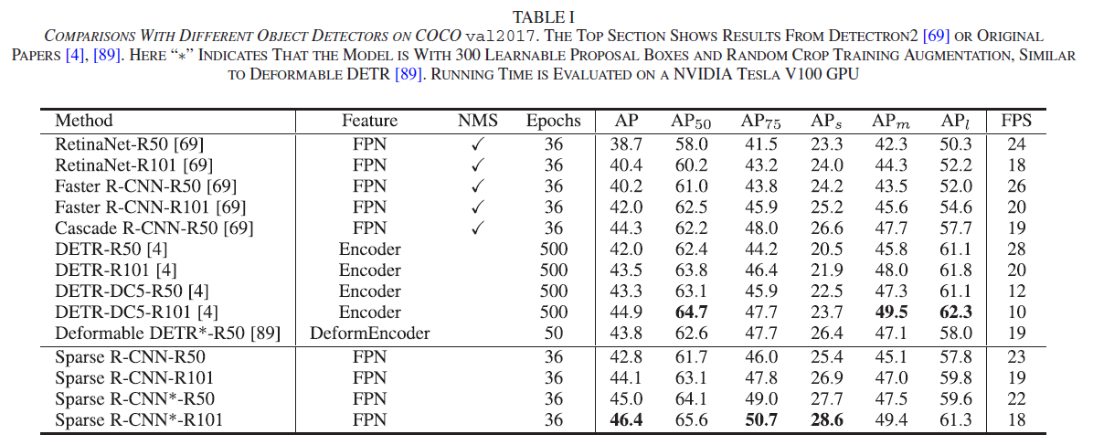 위의 테이블을 보시면, RetinaNet, Faster R-CNN과 같은 mainstream detector에 비해 훨씬 뛰어난 성능을 보였고, ResNet-50을 사용한 Sparse R-CNN이 42.8AP로, ResNet-101을 사용한 Faster R-CNN을 충분히 뛰어넘은 것을 확인할 수 있습니다.