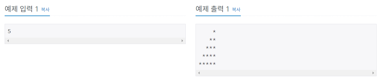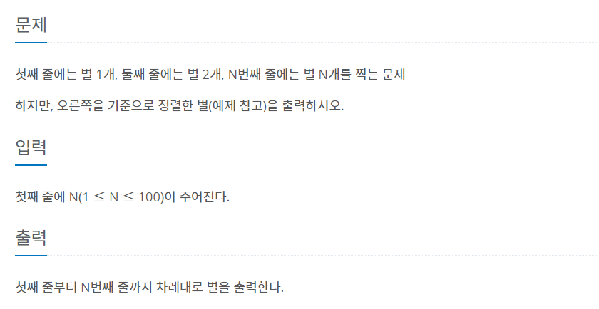 첫째 줄에는 별 1개, 둘째 줄에는 별 2개, N번째 줄에는 별 N개를 찍는 문제 하지만, 오른쪽을 기준으로 정렬한 별(예제 참고)을 출력하시오.