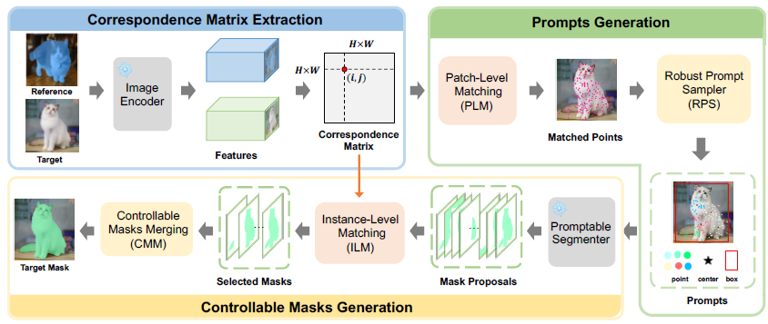 크게 3가지 component로 이루어져 있습니다 : Correspondence Matrix Extraction(CME), Prompts Generation(PG), Controllable Masks Generation (CMG).