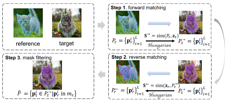 위의 그림에서 보면, 우선 z(t)와 reference mask에 대한 point P(r)={p(i)(r)} 간의 bipartite matching을 진행해 target image에 대한 forward matched point를 얻습니다. (S=sim(P(r),z(t)))