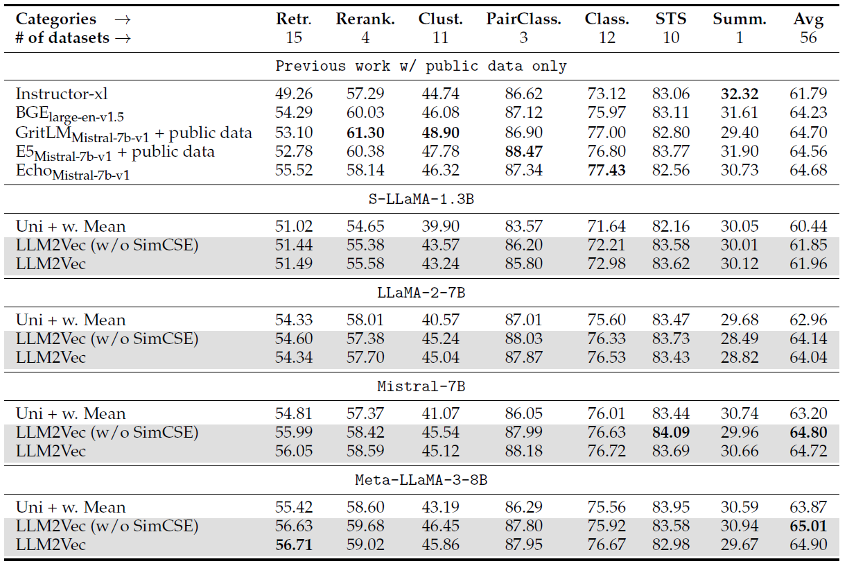 모든 model에 대해 LLM2Vec 변형버전이 Uni+weighted mean baseline보다 성능이 올랐습니다. 예상처럼, supervised training에선 unsupervised SimCSE는 크게 중요하지 않습니다. 그럼에도 불구하고 SimCSE를 사용하는 이유는 훨씬 sample-efficient하기 때문입니다.