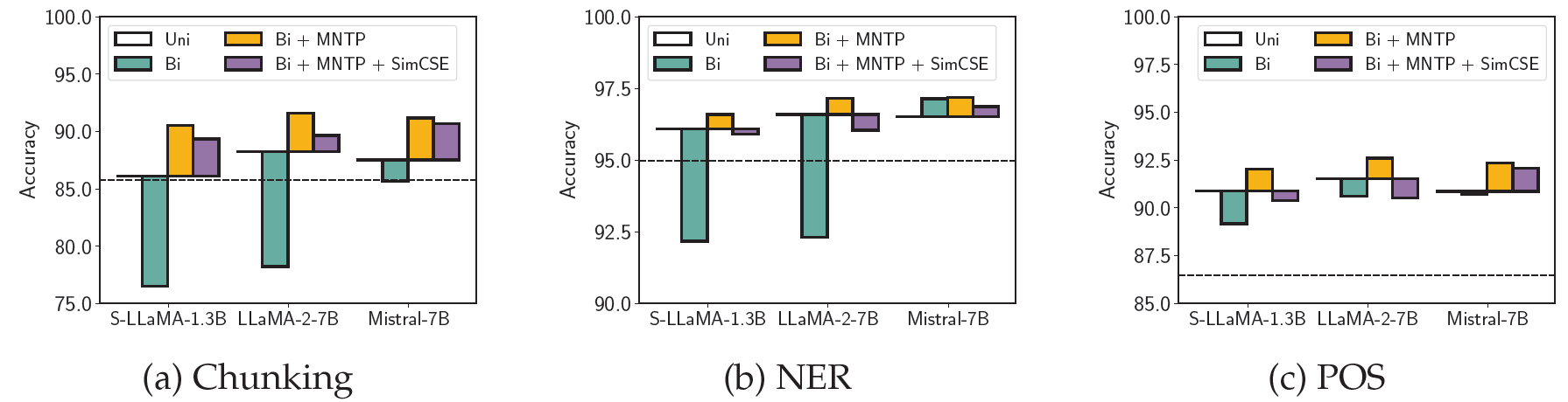 즉, 1(bidirectional attention), 2(MNTP)는 word-level task의 성능을 높이기 위한 것이고
