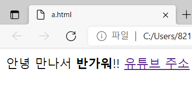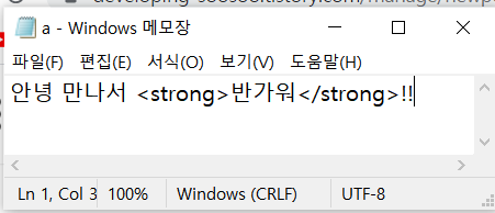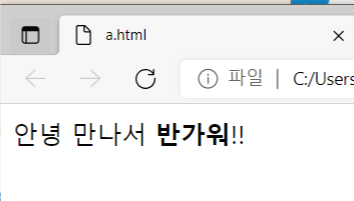 - 웹브라우저는 뷰어라고 할 수 있다 (보여주기)- 텍스트 안 ( 안녕 만나서 <strong>반가워</strong>!!) => strong 태그로 감싸져 있는 부분이 진하게 표시된다