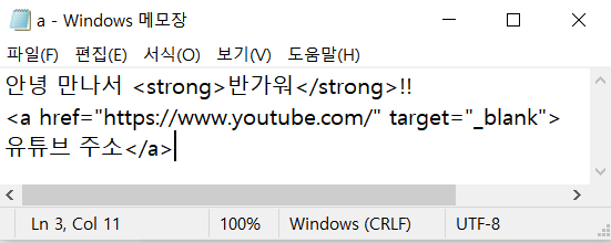 - 메모장에 텍스트 작성 후 확장자를 'html'로 저장하기. 파일형식은 모든 파일 형식으로 저장. txt아님 (ex: a.html) - a.html => a:파일의 이름, html:확장자 (즉, a파일은 html 파일)- 클릭하면 운영체제가 알아서 웹 브라우저를 통해 파일을 실행해줌