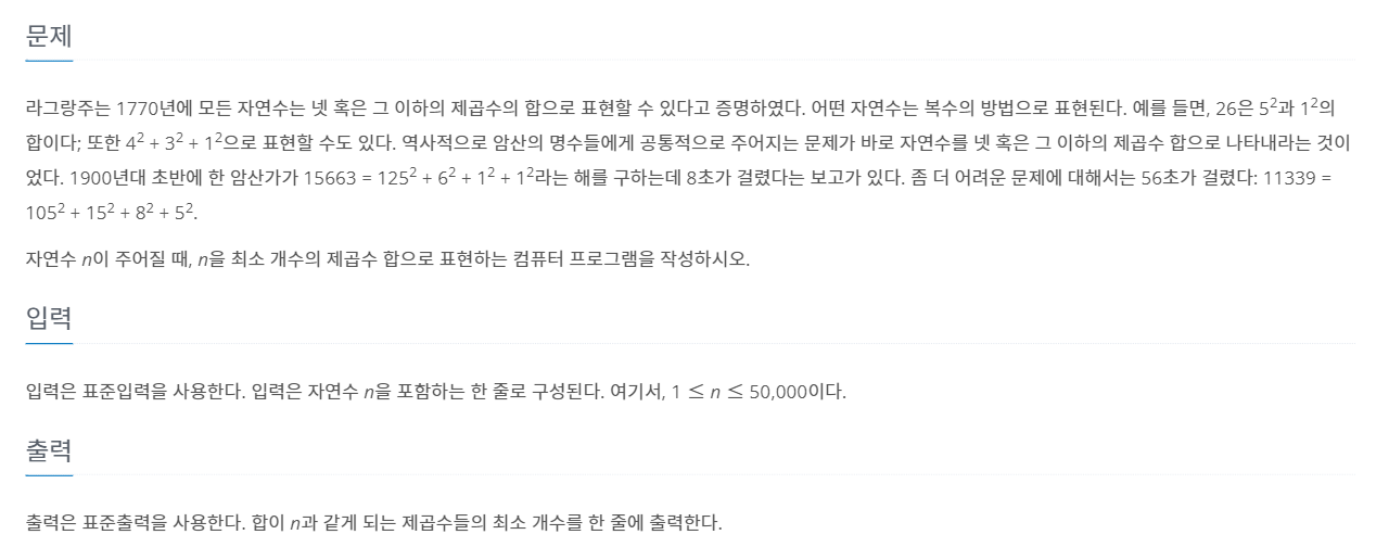 tmp = min(tmp, arr[i - j * j]+1);// 현재 값과 새로 구한 값 중 최솟값으로 수정