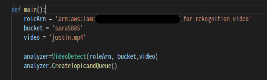 * 이 때 Bucket, Name, SNSTopicArn, RoleArn은 본인 버킷이름, 비디오파일,SNS ARN, 역할 ARN으로 바꿔주세요 *