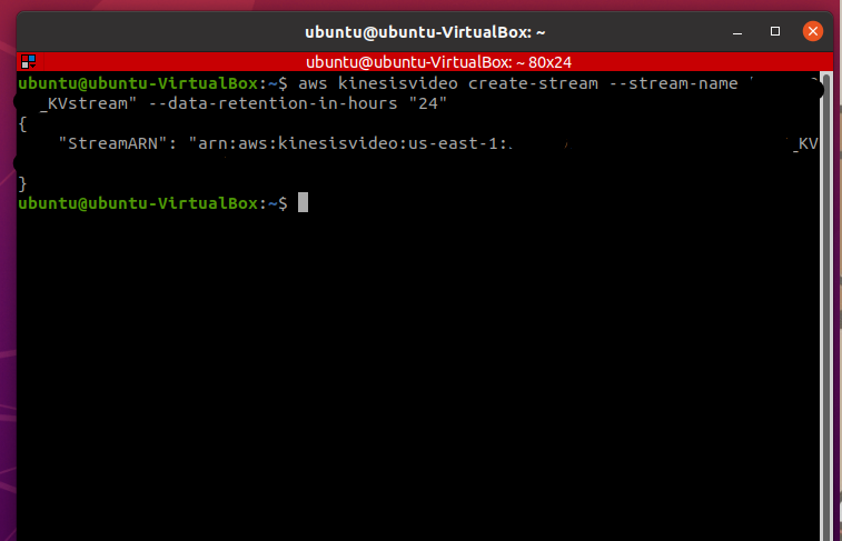 $ aws kinesisvideo create-stream --stream-name "MyKVStream" --data-retention-in-hours "24"