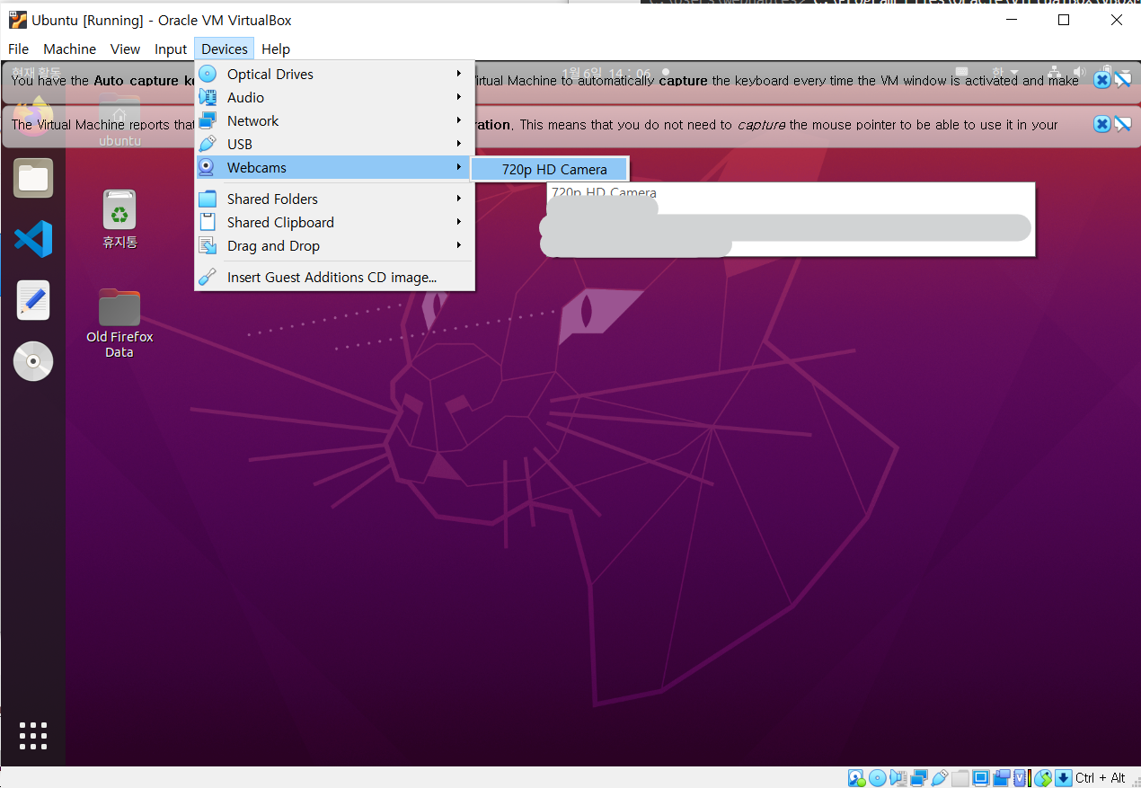 이 때 또 다른 문제점이 생겼습니다 ... Ubuntu를 virtual box로 진행하는 바람에 노트북에 내장되어 있는 카메라든 외부 디바이스든 Virtual box에 설치돼 있는 ubuntu에선 인식을 못한다는 점입니다....