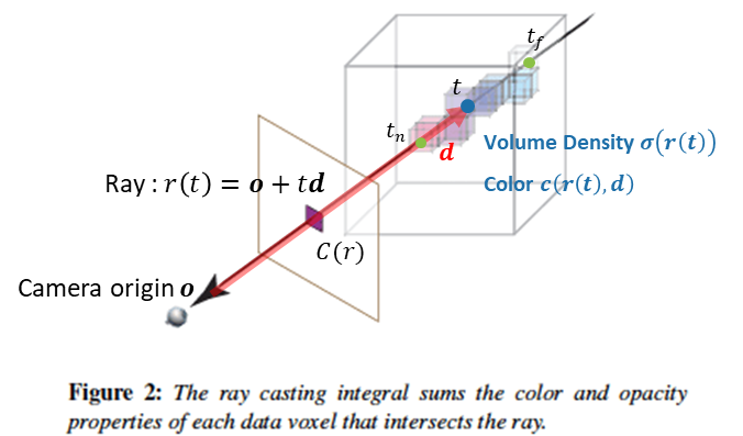 o에서 뻗어나가는 방향벡터를 d라하고 t를 임의의 값이라고 했을 때, 우리는 origin에서 뻗어나가는 r(t)=o+td ray를 생각해볼 수 있습니다. 해당 ray를 지나는 2D image의 pixel에서의 color를 C(r)로 구할 수 있습니다. 3D object나 scene에서 제일 가까운 point tn에서부터 제일 먼 point tf 까지의 모든 point들에 대한 color와 volume density를 MLP(FCNN)을 통해 구할 수 있습니다. 이렇게 구한 color와 volume density를 사용해 C(r)를 구할 수 있게 됩니다.