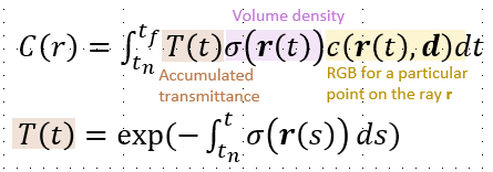C(r)의 식을 자세히 알아보겠습니다. 앞서 말한 tn에서 tf까지의 integral이고, c(r(t),d)는 해당 point에서의 color이고, sigma는 해당 point에서의 volume density가 됩니다. volume density를 고려하는 이유는 해당 point에서 어떤 color를 갖냐와 상관없이 만약 해당 point가 실제 물체가 있는게 아닌 공기 중의 point라면 해당 point를 고려하는 것이 의미없어집니다. 각 point의 투명도(밀도)를 고려하며 color를 축적해야합니다. 그리고 T(t)는 tn에서 t까지, 즉 해당 point보다 앞에 있는 point들의 투명도(밀도)도 고려해야 합니다. 해당 point에 물체가 존재하더라도 이미 앞에 밀도가 높은 물체가 있다면 현재 point가 갖고 있는 color는 큰 영향을 끼치지 못하기 때문입니다.