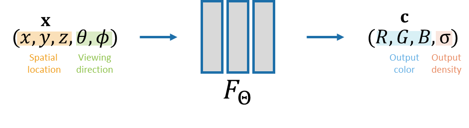 NeRF에 있는 MLP는 voxel coordinate과 viewing direction을 줬을 때 해당 voxel의 color와 density를 반환한다고 했습니다.